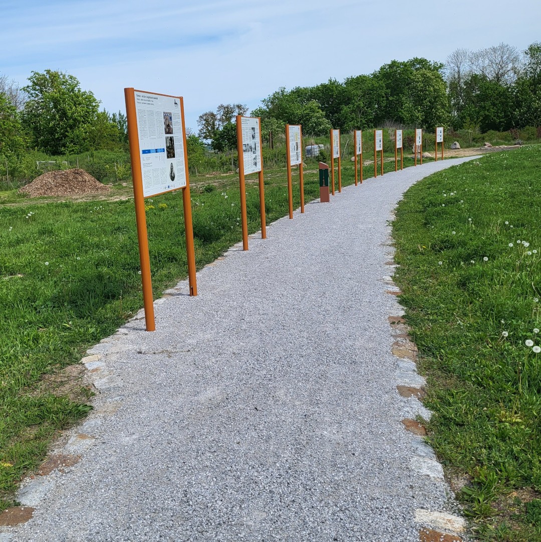 Today, the ‘Klessin Castle 1945 Theatre of War’ is a peaceful place of remembrance and encounter, built, maintained and supported by members of the Wuhden Heritage Society and many volunteers from the region, companies, institutions, funding agencies and donors. A circular trail with information boards, acoustic steles and metal sculptures, as well as original shell holes and trenches, commemorates the events of the war. The memorial was officially inaugurated on 5 May 2023 and has been open to the public ever since.