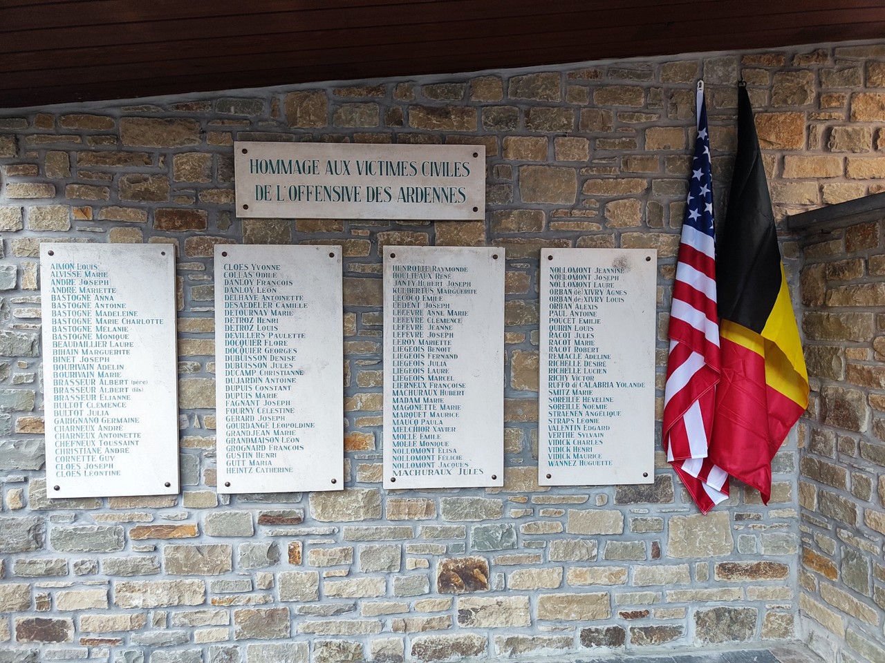 During the Battle of the Bulge, the town of La Roche-en-Ardenne was heavily bombed by Allied aircraft. In December 1944 and January 1945, 114 people lost their lives. Four commemorative plaques have been affixed to the memorial dedicated to the civilian victims, bearing the names of the deceased.