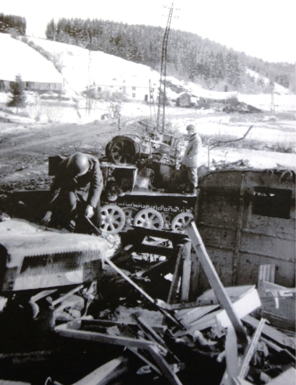 With the town of Houffalize blocked by ruins and the Allies having cut off the roads further north in their advance, German convoys soon had only one available route of retreat, via Achouffe. Endless columns of motley vehicles stretched towards this narrow crossing point, insignificant on military maps, but whose bridge suddenly assumed considerable importance. The roads leading to it were icy and snow-covered. Teams were busy spreading gravel on the road and clearing out vehicles that had broken down or were stuck in ruts. Once over the bridge, the traffic then began the arduous climb towards the village of Mont, before the shreds of units took the most direct route to Germany.