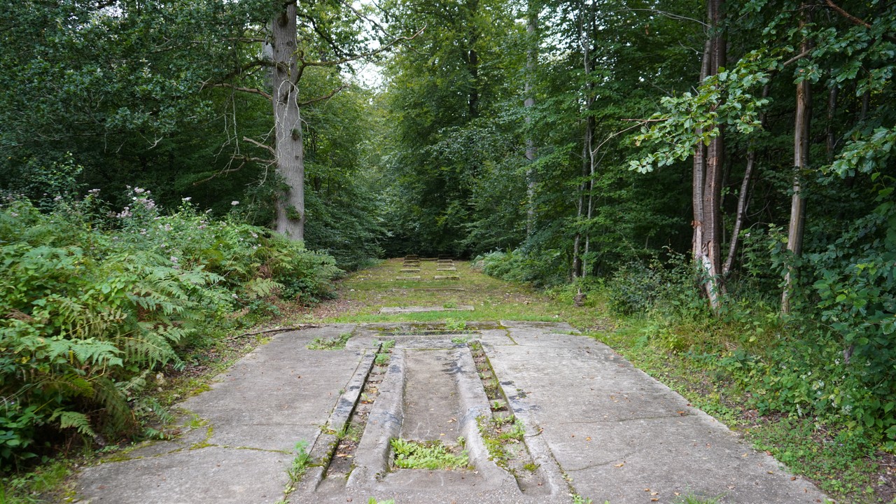 However, it is distinguished by a long, straight access track, the ‘Stellfläche’, which is used to store V1s awaiting preparation. Simplification is taken to the extreme, as this type of base comprises just one building: the firing bunker. The entire process of deploying a V1 is therefore carried out without any permanent structures. With the exception of the firing bunker, concrete was used here only for ground works: concrete paths for driving around the site, a water tank and a non-magnetic platform. There is a partly sloping preparation slab for the drainage of rinsing water. In addition, on the highest part of the site is the non-magnetic