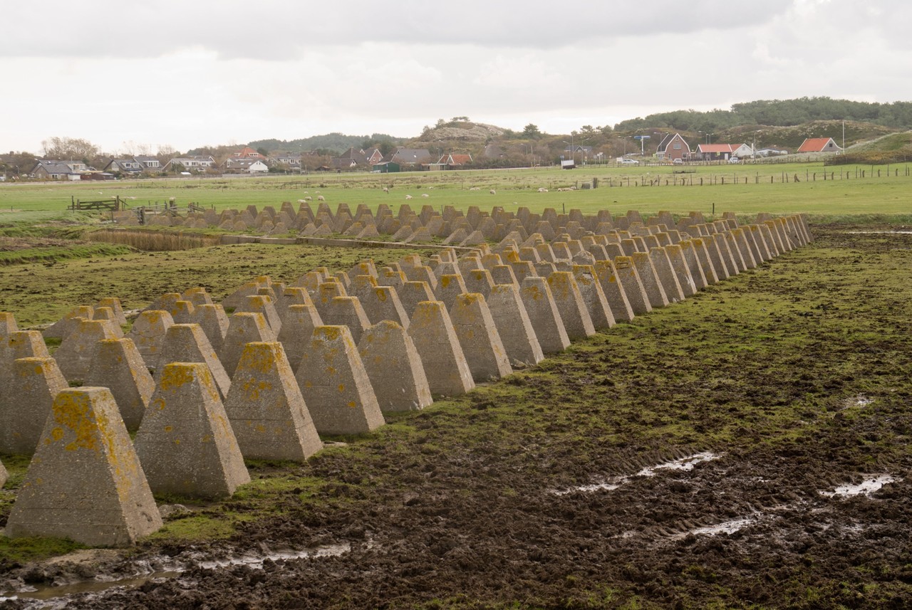 The concrete blocks (in German: Höckerhindernisse) were placed here during World War II to block the road for Allied tanks. They were part of the Schoorl support point group (Steunpunktgruppe Schoorl), which included Bergen, Schoorl, Groet, and Camperduin, and consisted of more than 700 structures. The dragon’s teeth were used to reinforce weaker points, for example where a tank ditch could not be constructed. The idea was that tanks would get stuck on them, preventing the crew from advancing further.